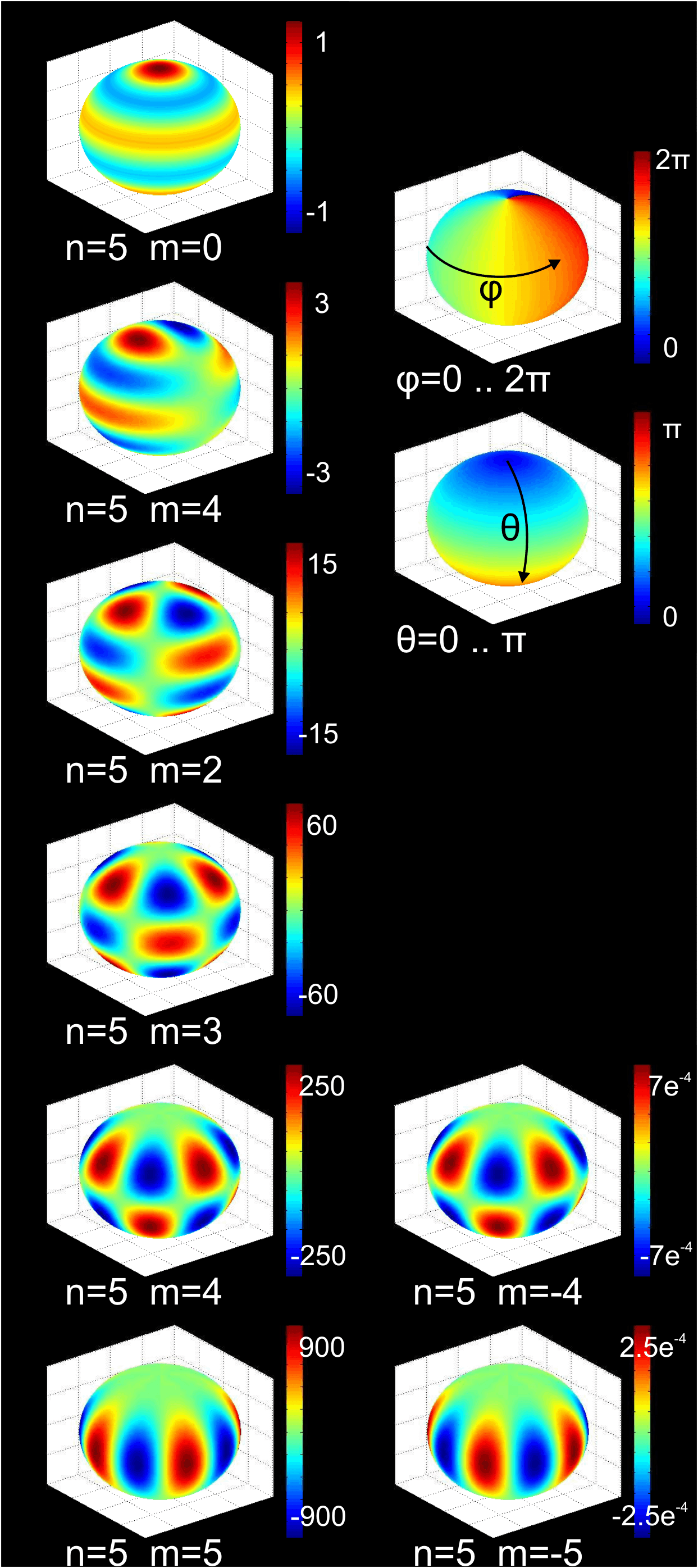 - Figure showing the real spherical harmonics Yl,m for l=0 to 4 (top to bottom) and m=0 to 4 (left to right). The negative order harmonics Yl,-m are rotated about the z axis by 90o/m.
