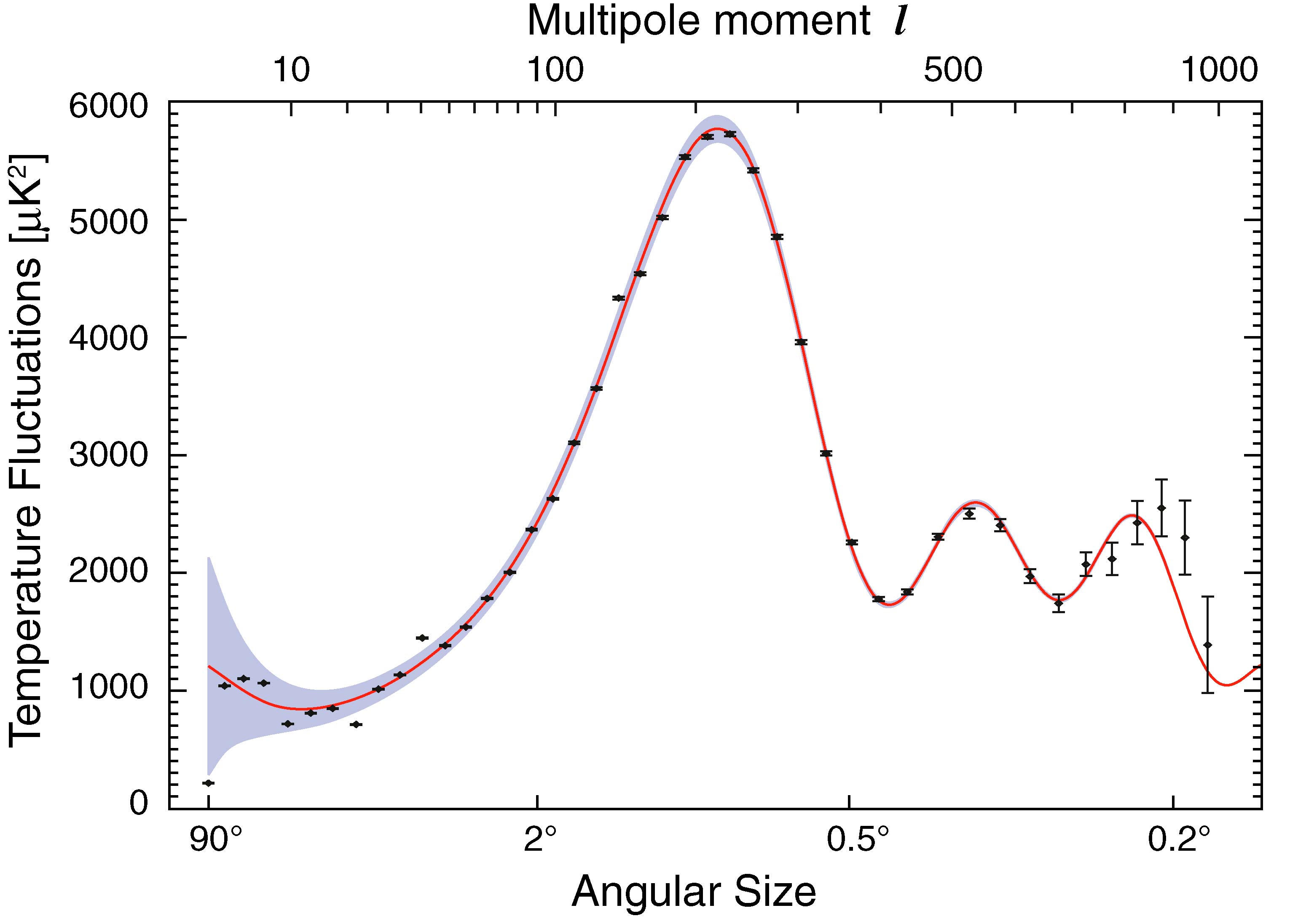 This image has been decomposed using spherical harmonics to produce a power spectrum to show the temperature fluctuations as a function of angular size scale. The image below shows this decomposition. The points are the measured values and the curve the predictions of a model.