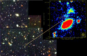 A MERLIN/VLA radio image at 1.4 GHz (shown as contoured radio brightness) overlaid on the optical image of the Hubble Deep Field from The Hubble Space Telescope. Although only the faintest of optical emission is detected at this position, this weak radio source is identified with a very red object and is thought to be a luminous starburst system close to the edge of the visible Universe with a redshift close to 4.4. The sensitivity and angular resolution of e-MERLIN at 5 GHZ will enable such object in the future to be studied in significant detail.