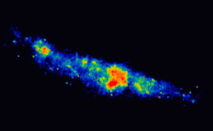 A false-colour radio image at 5 GHz of the nuclear region of the starburst galaxy M82 mapped with MERLIN and the VLA . This galaxy is around 10 Million light years distant and the nuclear region is ~3000 light years in extent. The compact objects are recent super nova remnants from massive stars made in the starburst which explode only a few Million years after formation.