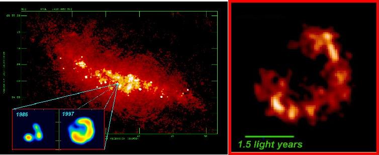 (Left) A MERLIN+VLA radio image of the central part of the nearby galaxy Messier 82 (M82) showing some of the supernova remnants present. Inset are images of the youngest remnant observed in 1986 and 1997, obtained by combining data from European radio telescopes which shows clear expansion over the 11 years. (Right) A highly detailed image, observed in November 1998, of the same remnant obtained from a 'World Array' of telescopes showing for the first time, the complex interaction of the ejected material with its surroundings.