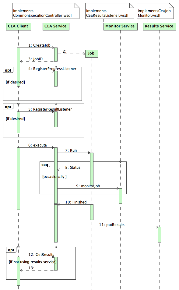 The interaction between the CEA client and the CEA server follows a similar pattern for both the interfaces. There are some extra intermediate steps that may be called between these steps, but the steps listed below are the essential interactions that can be performed on either interface for the complete execution of a job and retrieval of the results.