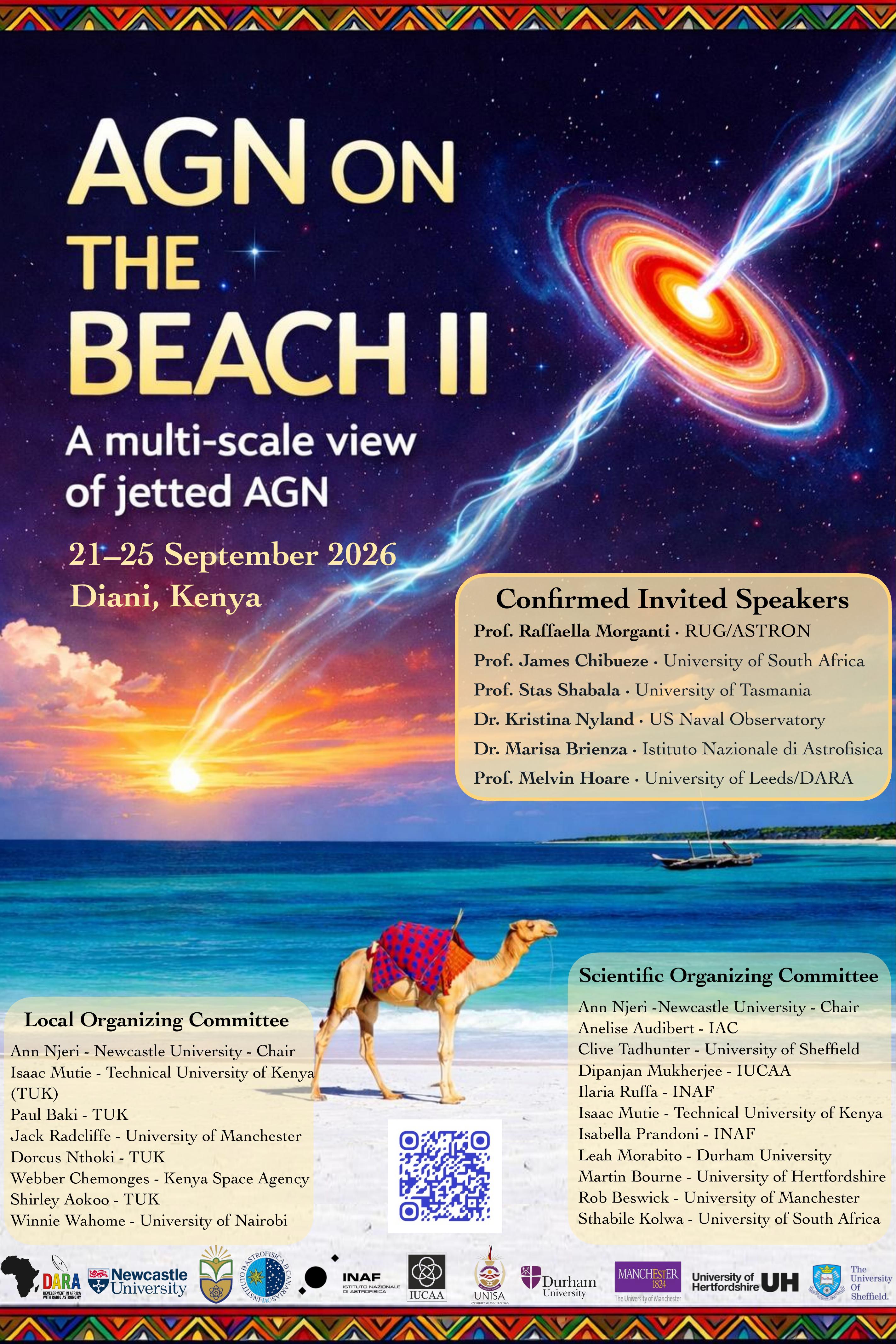 AGN on the Beach II: A multi-scale view of jetted AGN will gather the community in Diani, Kenya to connect breakthroughs in high-resolution observations, hydrodynamical simulations, and theory, and to build a coherent picture of how compact radio outflows shape galaxies. While relativistic jets are established agents of feedback in AGN, the role of compact radio outflows—whether jets or winds—remains uncertain and actively debated. New capabilities in high-resolution radio/mm interferometry, IFU spectroscopy, and sensitive low-frequency imaging, together with advances in hydrodynamical simulations, now show that even low-power or small-scale jets on (sub-)kpc scales can strongly perturb the ISM, driving shocks and turbulence and altering star formation locally. Yet we still lack a unified, multi-scale framework linking (i) SMBH accretion and jet launching on sub-parsec scales, (ii) observed radio morphologies on pc-kpc scales, and (iii) the net impact on galaxy evolution across environments and cosmic time.