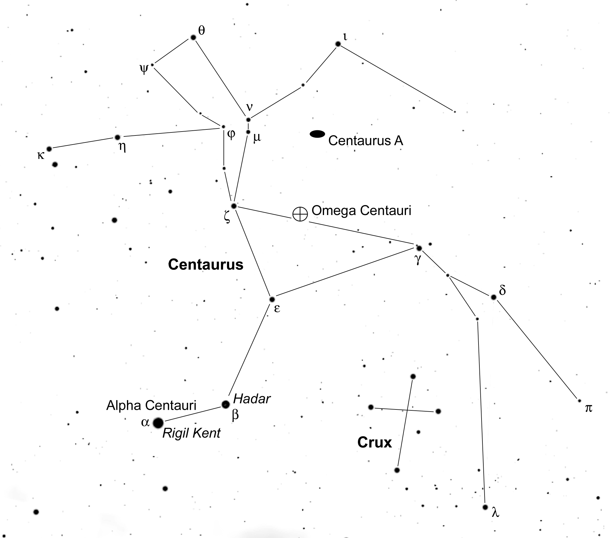 Though not as well known as Crux, the Southern Cross, there is no doubt that Centaurus is the most impressive southern constellation of all. The ninth largest constellation in the sky, over 100 of its stars are visible to the unaided eye. Centaurus lies too far south to contain any Messier objects. It does, however, contain three A-List objects: one of these, Alpha Centauri, is the nearest star system to our Sun, another the best globular cluster in the heavens and the third a dynamic galaxy. Best observed in the autumn when it comes almost overhead.