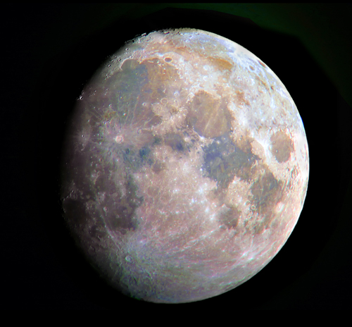 We think of the Moon as simply being visible in (very dark) shades of grey. But this is not quite true, as there are some very subtle colour differences which can be brought out with a suitable imaging process as described in the Astronomy Digest. In fact, this image tells us a little about the Moon's surface geology, as the bluish colour of Mare Tranquillitatis indicates that the basalt lava contains more titanium (TiO2) than Mare Serenitatis up to its left which contains relatively more iron (FeO) giving it a redder colour. The southern portion of Mare Tranquillitatis contains the highest proportion of Titanium on the lunar surface at 4.4%.