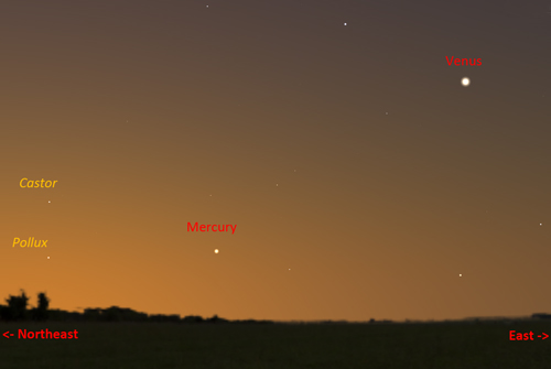 Given a clear morning during the last week of July - and the ability to get up very early - Mercury, at Magnitude -0.6 will be visible lying down to the lower left of Venus. Castor and Pollux lie across to its left.