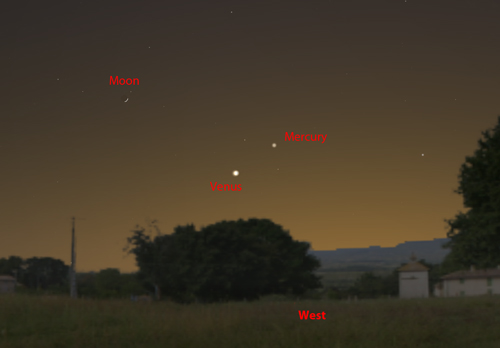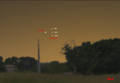 The constellation Gemini is now setting towards the south-west and Leo holds pride (sic) of place in the south with its bright star Regulus. Between Gemini and Leo lies Cancer. It is well worth observing with binoculars to see the Beehive Cluster at its heart. Below Gemini is the tiny constellation Canis Minor whose only bright star is Procyon. Rising in the south-east is the constellation Virgo whose brightest star is Spica. Though Virgo has few bright stars it is in the direction of of a great cluster of galaxies - the Virgo Cluster - which lies at the centre of the supercluster of which our local group of galaxies is an outlying member.