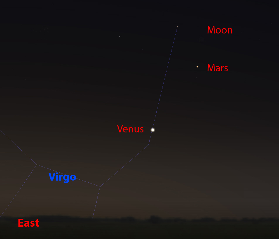 Looking Eastwards before dawn on the 17th, a thin crescent Moon will be seen high above Venus and Mars.