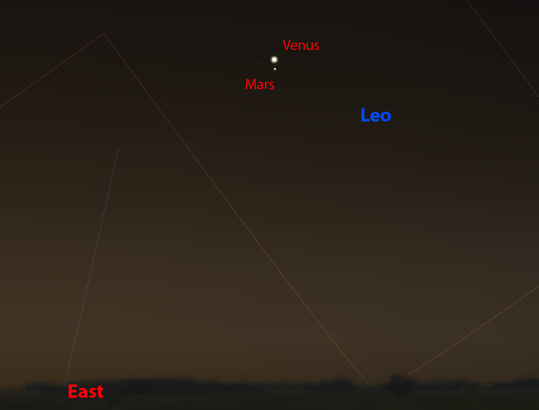 Before dawn on the 5th, Venus and Mars will lie just a quarter of a degree apart in the eastern sky.
