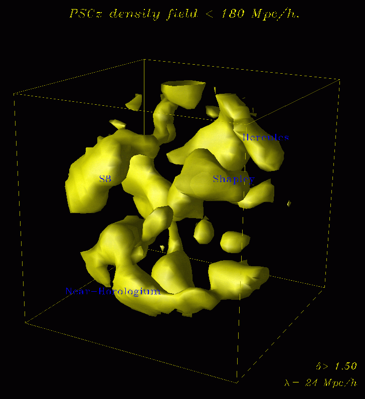 Later it was found that large `sheets' of galaxies like the Supergalaxy are a typical feature of the distribution of galaxies; in between them lie large voids where no galaxies are found. As surveys pushed further out in redshift, theorists predicted that they would soon reach the scale of homogeneity. Instead, during the 1980s each new survey found structures crossing the whole volume. A particularly striking example was the `stick man' distribution found in the CfA2 redshift survey, lead by Margaret Geller and John Huchra (Fig. 2.17). In the centre of this map, the major galaxy cluster in Coma appears as a finger pointing towards the observer: notice that it lies at the intersection of several filaments (which are actually slices through sheets). This pattern of voids surrounded by filaments and sheets, with clusters at their intersections, has become known as large-scale structure, or. more colloquially, the Cosmic Web.