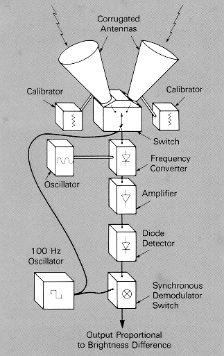 Fluctuations in the CMB on scales smaller than the dipole were at last discovered by the Differential Microwave Radiometer (DMR) instrument on COBE. The DMR consisted of three units, one each operating at 31.5, 53, and 90 GHz. A block diagram of a single unit is shown in Fig. 2.20. As in many experiments designed to look for anisotropy in the CMB, each unit observed in two directions simultaneously. In the DMR this was simply achieved by rapidly switching between two identical microwave horn antennas, pointing 60o apart. All the horns had a 7o beam width. Each DMR unit contained two independent channels. At 53 and 90 GHz each channel had its own pair of horns, so that each horn spent half its time disconnected. At 31 GHz the two channels swapped between the same pair of horns in antiphase.