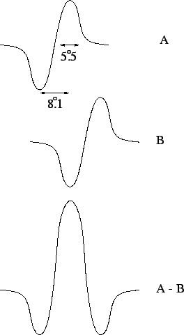 Like COBE, the experiment measured the difference in T between two points on the sky. But ground-based experiments, even on high mountains like Teide, have to contend with emission from the atmosphere, which varies greatly across the sky. Therefore the two directions are only 8.1o apart; on this scale, the atmosphere is fairly constant. To further eliminate atmospheric fluctuations, the pointing direction is switched on a 16 second cycle by tilting a flat mirror (technically `chopping'), giving the sky response shown in Fig 2.23. The chopping mirror directs the beams nearly vertically (i.e. towards the zenith), and a circle on the sky at fixed declination is observed as it transits through the telescope beam due to the Earth's rotation. Despite these precautions a significant amount of data had to be discarded due to atmospheric emission; data was also discarded when the Sun or Moon were within 50o of the zenith, because even so far from the pointing direction they produced a significant contaminating signal.