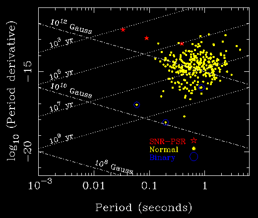 Apart from showing only a small number of pulsars, the P-Pdot diagram of 1982 shows pulsars only in the upper right part of the diagram. This reflects theories that predict the end of a pulsar's life as a radio source as soon as it had slowed down too much, preventing the radiating plasma being created above the polar cap. This was consistent with pulsars being observed with periods in the range typically 0.6 to 1.0 seconds and period derivatives (Pdots) of 10-15 seconds per second. Figure 2 shows a recent image of a lonely, dead and cooling neutron star obtained with the Hubble Space Telescope (HST).