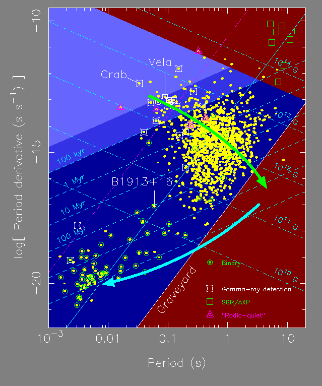 Figure 3. This P-Pdot diagram includes arrows showing the evolution of pulsars with all pulsars discovered since 1999 in the Parkes Multibeam survey as yellow dots. |