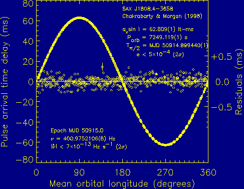 Figure 4(b). Beautiful sine wave variation in pulse arrival time caused by the pulsar orbiting its binary companion. |