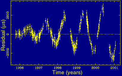 Accounting for all possible effects including the pulsar spin down, we should be able to predict the arrival times and to compare these predictions with actual measurements. These differences between model predictions and observations called "residuals" are plotted versus time and should vary randomly around zero, as shown in Figure 4(a), if the model is correct.