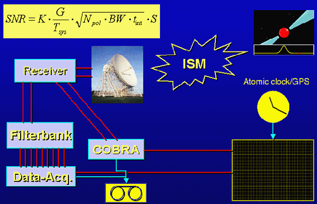Figure 2. Schematic of pulsar observing system. The pulses emitted by the pulsar (upper right) propagate through the interstellar medium (ISM), before being picked up by a telescope and the installed receiving system. In a standard approach the total bandwidth is split into smaller channels by a filterbank (for each polarisation). The signals of each filterbank are acquired by a data acquisition system and recoded along with information from the observatory's atomic clock which is synchronised to an international time standard with GPS. |