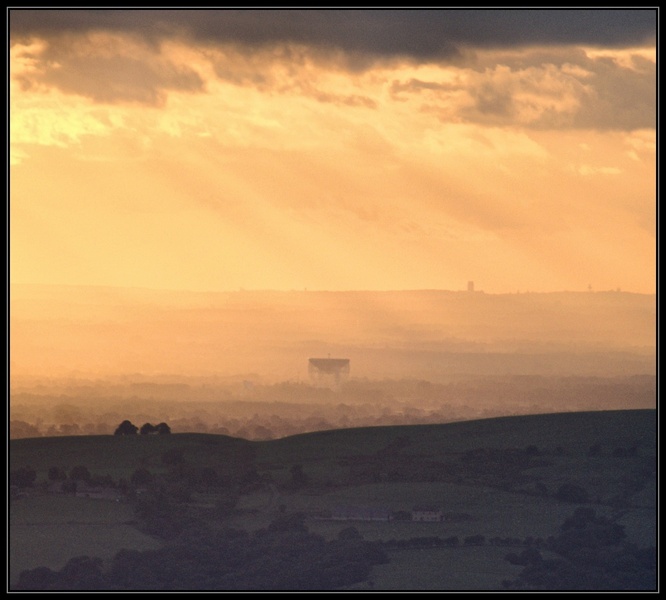 Taken from the Roaches at the southwestern edge of the Peak District by Dr Anthony Holloway of Jodrell Bank, this photograph shows the Lovell Telescope on the Cheshire Plain with the Cathedrals in Liverpool 45 miles away visible on the skyline.