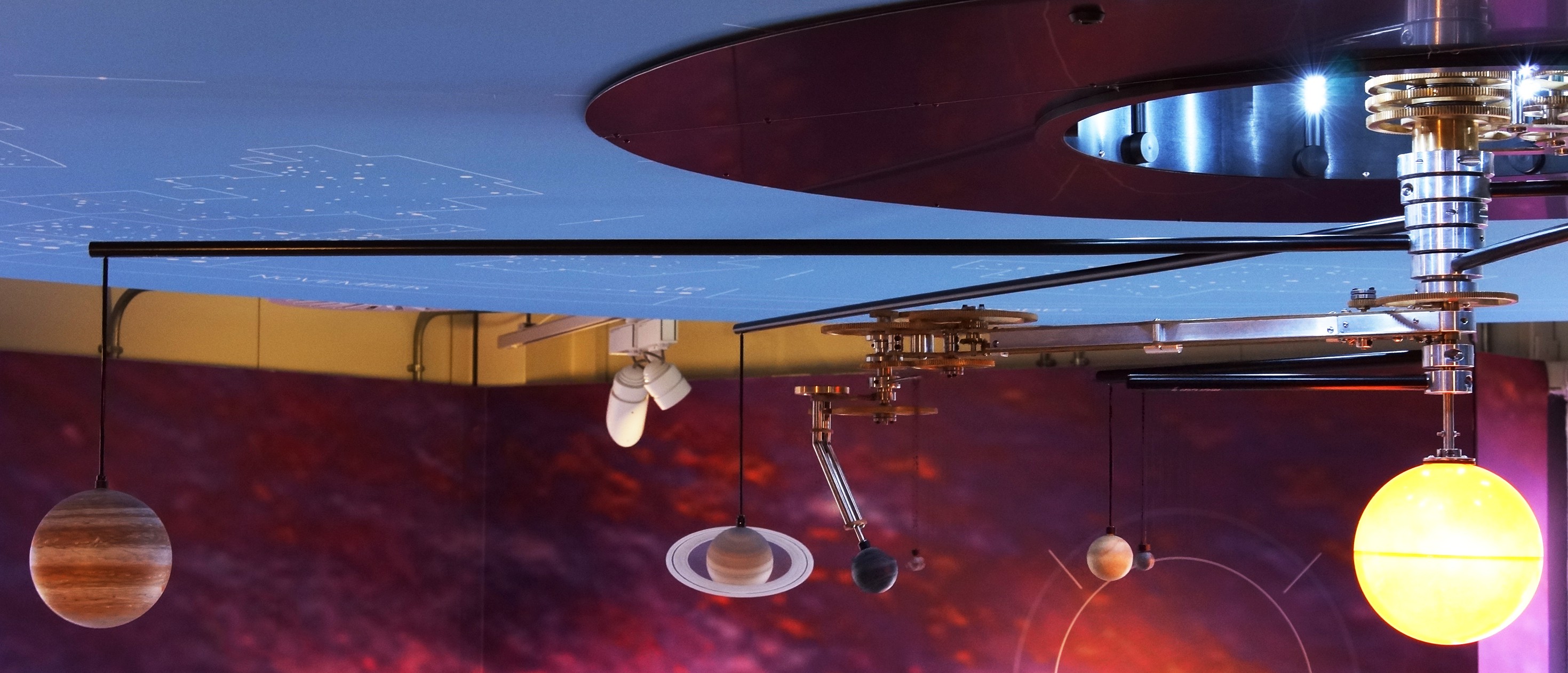 Built in Acton in London by the innovative team at Science Projects, the Orrery turns against a giant 'clockface' in the ceiling of the Gallery, which depicts astronomically accurate constellation maps set out in their relevant positions in the sky. The installation of the exhibit is now complete and will be open from Monday 25th March - and throughout the Easter Holiday period.