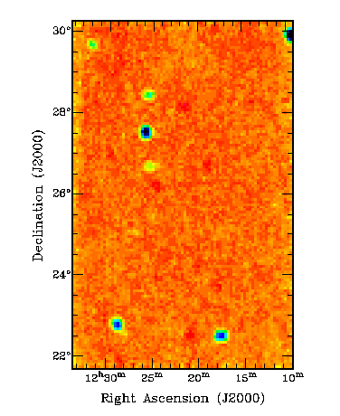 Observing run - Dec 2002 to Feb 2003The latest observing run was for 2 months over winter 2002-2003. The run was very successful, and we observed over 1000 sq degrees of sky. The observations were concentrated along the Supergalactic plane, including the Ursa Major Cluster. This is the first time that the whole of Ursa Major has been surveyed in HI. We also observed nearly the whole of the Northern Celestial Cap region of sky (dec. > +78 degrees).Below is a HI peak intensity map of the Supergalactic plane, between declination +22 to +54 degrees, and RA 11h30m to 13h. Each white/orange point is a galaxy detected by HIJASS. The concentration of galaxies seen top-middle of the plot is the Ursa Major cluster.