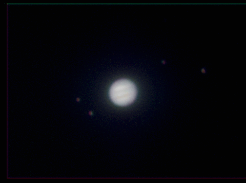 clearly visible, as are the Galilean Satellites. The misalignment of the satellites colours is due to their motion around the planet during the exposure. The Great Red Spot is on the far sie of the planet.