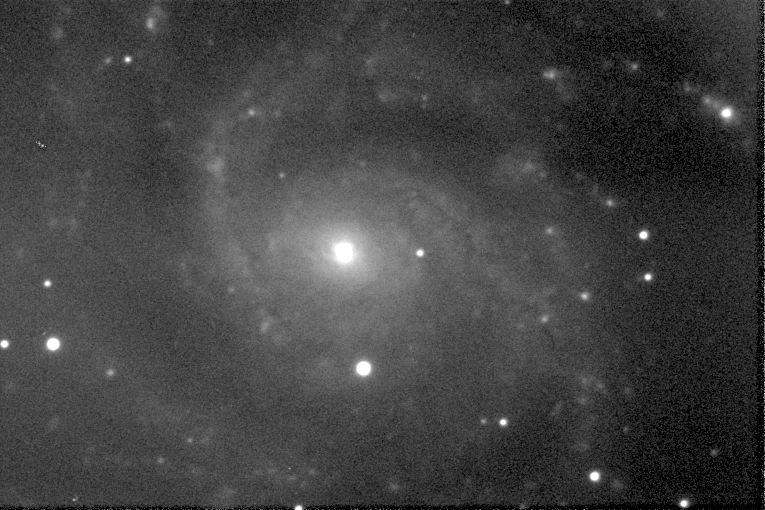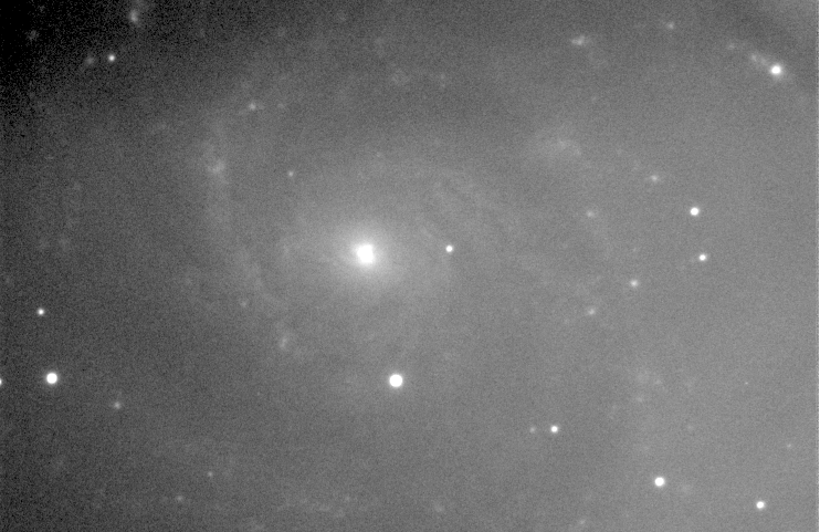 Image information: Stacked, dark-subtracted, registered combination of 144 x 10s unfiltered images. An unsharp mask has been applied to bring out the arms and HII clouds. Images taken on 09/03/2007. The horizontal lines are due to imperfect bias subtraction, which has been smeared by tracking errors. |