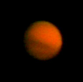 Image information: Image taken 17/11/2005 20:30-21:00 UT, using a Sony DSC-H1 bootstrapped to the back of the 12" telescope. A stack of 8 exposures with varying parameters was used to achieve disc contrast, then averaged with a single image contrast enhanced and sharped to bring out detail. Physical information: Disk diameter: 18.9", centre at long. 6, lat -17.4, south pole earthward & sunlit, phase 0.993, distance 0.495AU (74M km), altitude 44 degrees. |